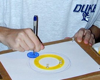 On disposait d’une roue dentée en pastique qu’on épinglait sur une feuille sur un support cartonné. Cette roue avait des dent à l’extérieur et à l’intérieur. On choisissait une autre roue dentée qui venait tourner sur ou dans la précédente…