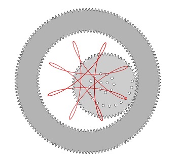 Tout cela c’est encore des maths : des cycloides. Hypocycloïdes ou épicycloides suivant qu’on tourne à l’intérieur ou à l’extérieur de la roue principale.