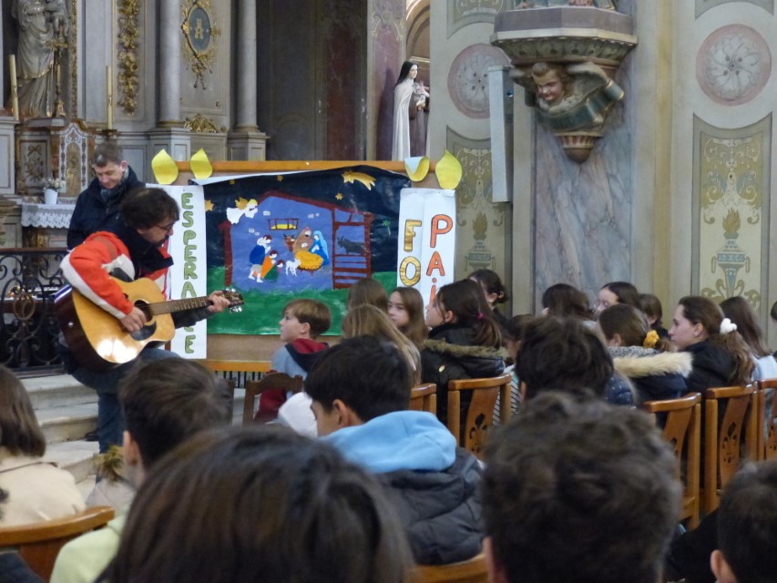 La Chorale de l’école a interprété un chant de Noël accompagné, à la guitare, par leur professeur de musique. Paul, à la trompette et Eugénie à la flûte traversière nous ont aidés à chanter et prier.